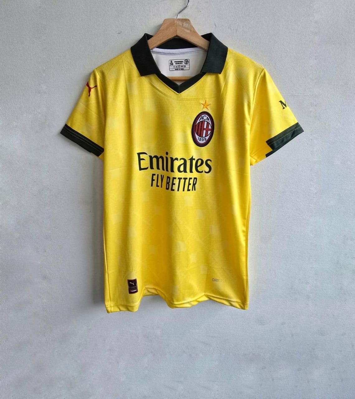 The jersey features a brilliant yellow design complemented by a classic black polo collar and sleeve cuffs, blending modern style with timeless elegance. A subtle tonal checkerboard pattern is embedded in the fabric, adding a sophisticated touch. The official A.C. Milan crest sits proudly on the chest, alongside the “Emirates FLY BETTER” sponsor.