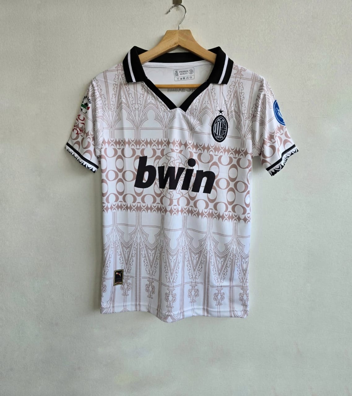 • Design: The jersey has a white base with an intricate, all-over pattern in a brownish-beige color. The “bwin” sponsor is printed in black. The sleeves and collar feature a black and white stripe design, and the left sleeve has a scudetto patch.