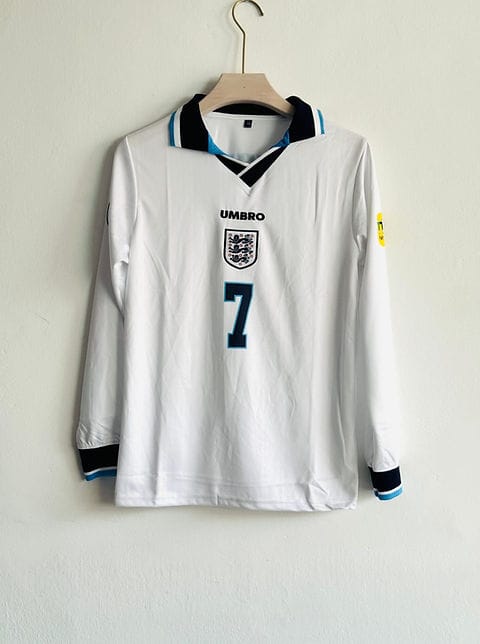 Step back into a golden era of English football with this timeless 1998 World Cup Home Jersey by Umbro. This is a high-quality replica of the classic long-sleeve shirt worn by the Three Lions during one of the most memorable tournaments in their history.