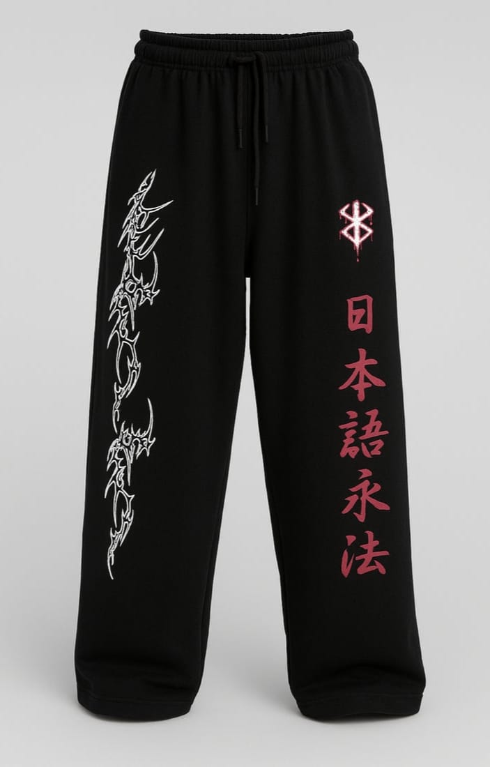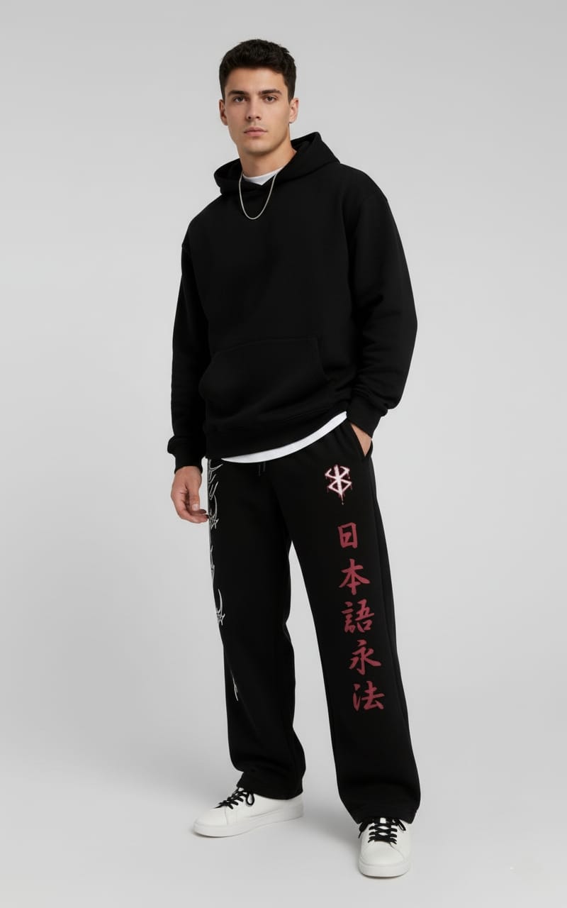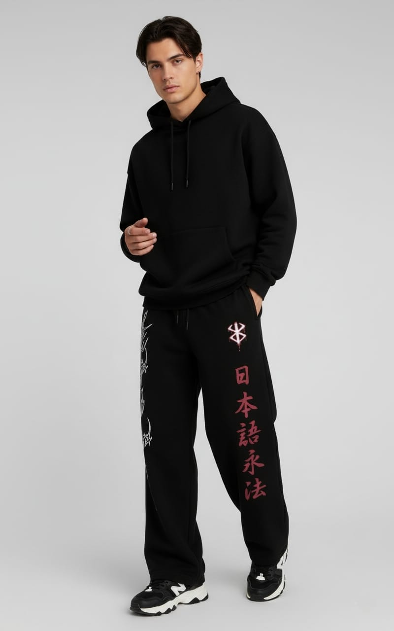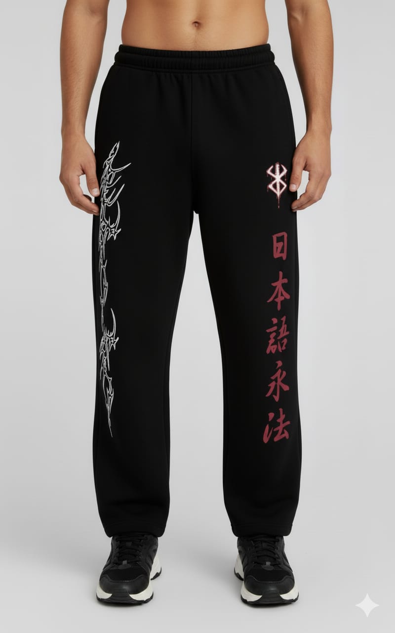 Level up your streetwear look with these black joggers for men featuring Japanese lettering and tribal graphic prints. Designed with a relaxed fit, elastic waistband, and soft cotton blend fabric, these joggers are perfect for casual outings, gym sessions, or stylish everyday wear.