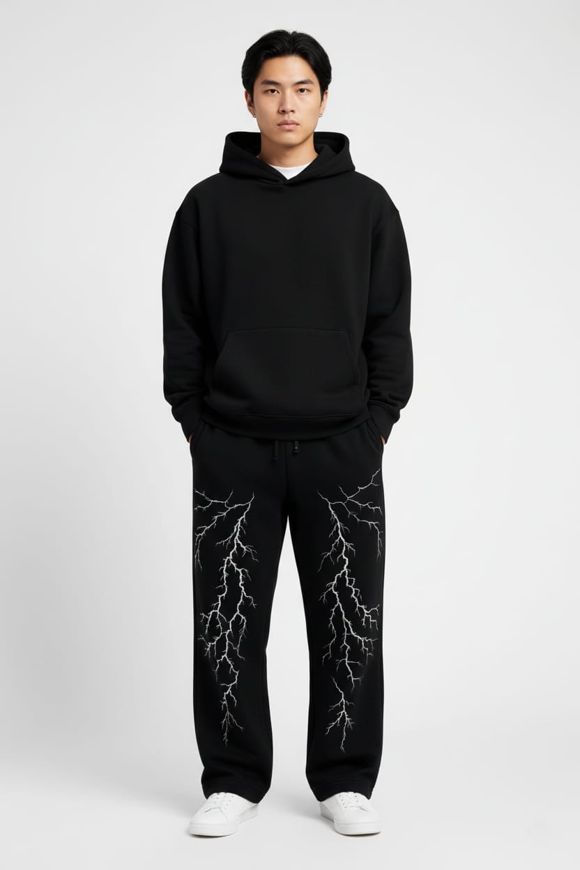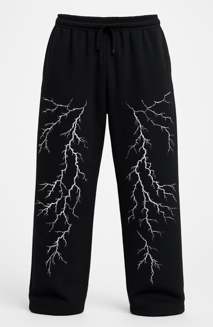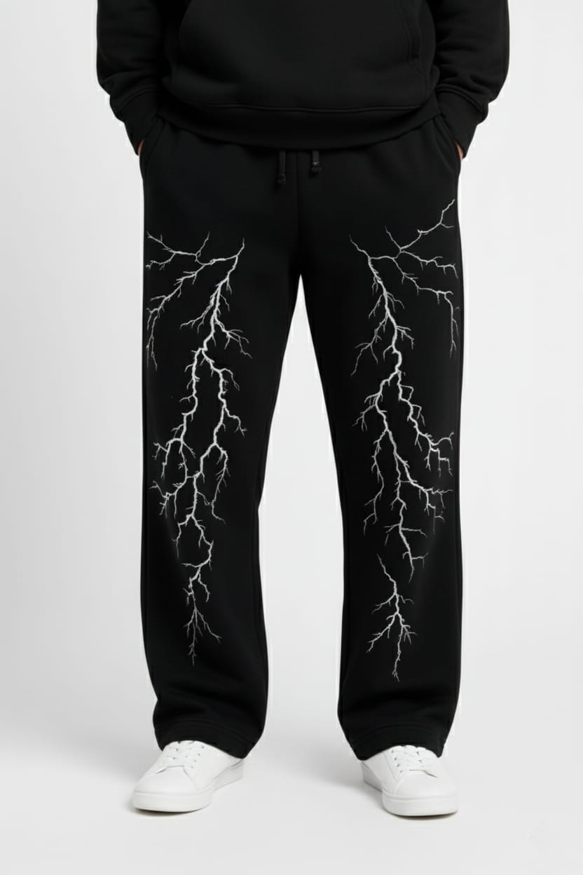 Make a bold statement with these black lightning print joggers for men, designed with striking white electric patterns on both legs. Featuring a relaxed fit, elastic waistband, and soft cotton blend fabric, these joggers blend comfort with edgy streetwear style—perfect for casual wear, travel, or gym sessions.
