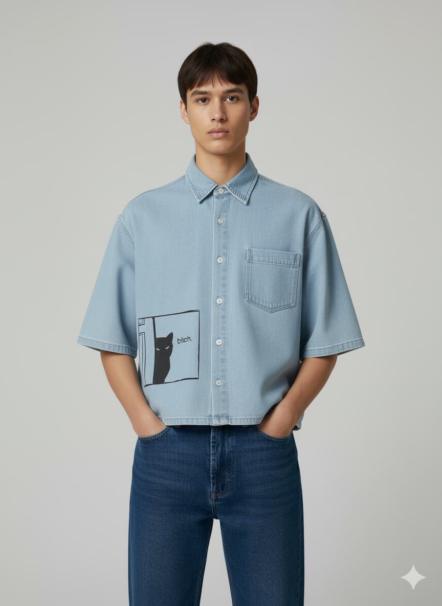 Redefine casual cool with this Men’s Light Blue Crop Fit Boxy Shirt with Cat Print. Crafted from a comfortable denim cotton blend, this shirt combines style and ease for everyday wear. The boxy relaxed fit with a cropped silhouette adds a trendy streetwear vibe, while the quirky black cat graphic print on the front sets it apart with a playful edge. Featuring a spread collar, button-down front, and a chest patch pocket, it blends classic elements with modern fashion.