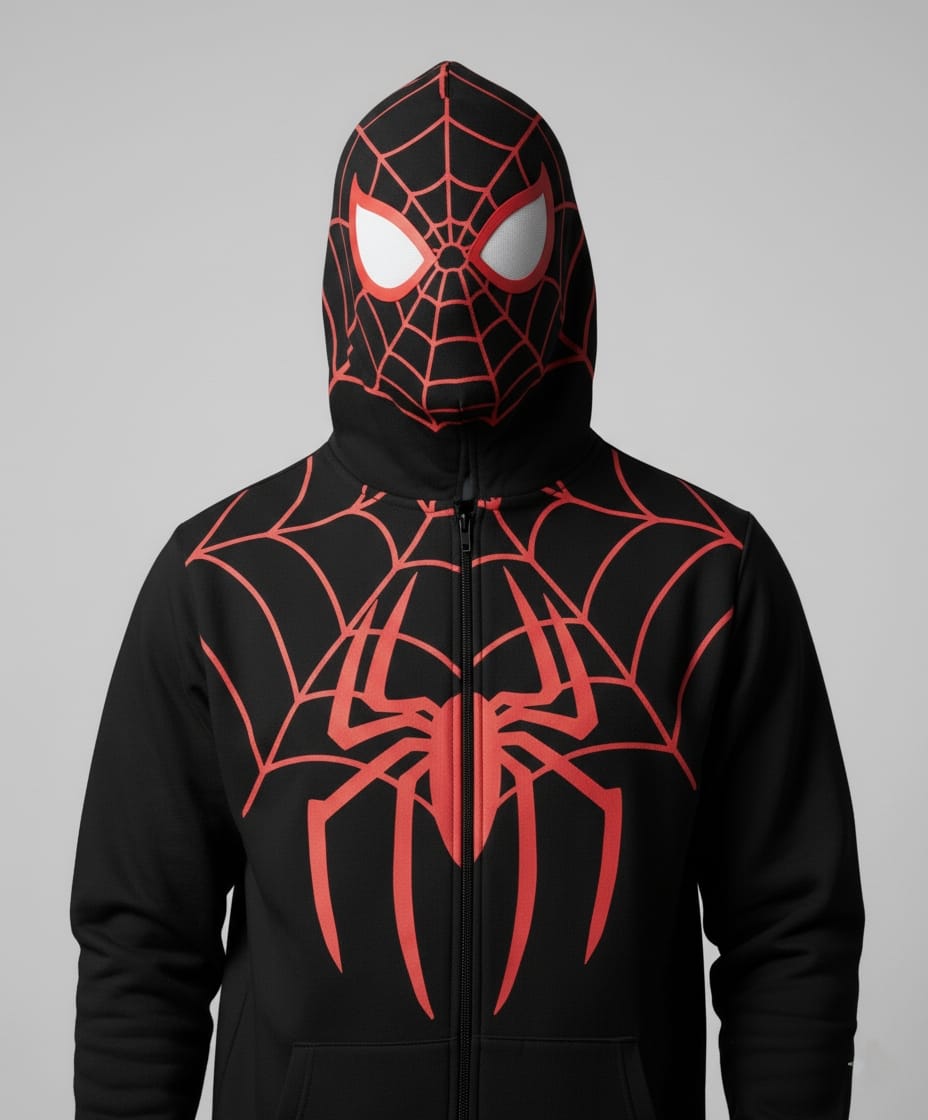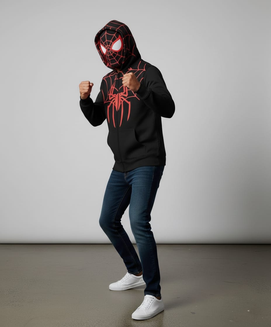 Bring out your inner superhero with this Spider-Man inspired black hoodie for men. Featuring a bold red spider print, full zip closure, and a unique hood with printed eyes, this cotton-blend hoodie is perfect for casual wear, cosplay, or winter layering.