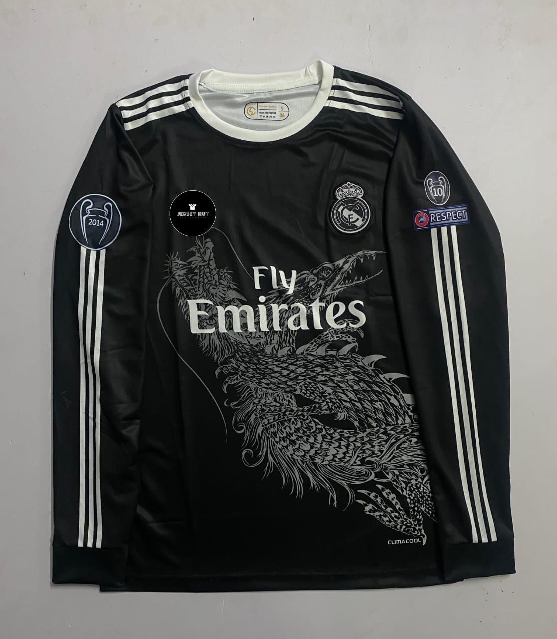 • Design: The jersey has a black base with a stunning, large white dragon graphic that dominates the front. The Adidas three stripes on the shoulders are white, and the sleeves feature multiple patches.