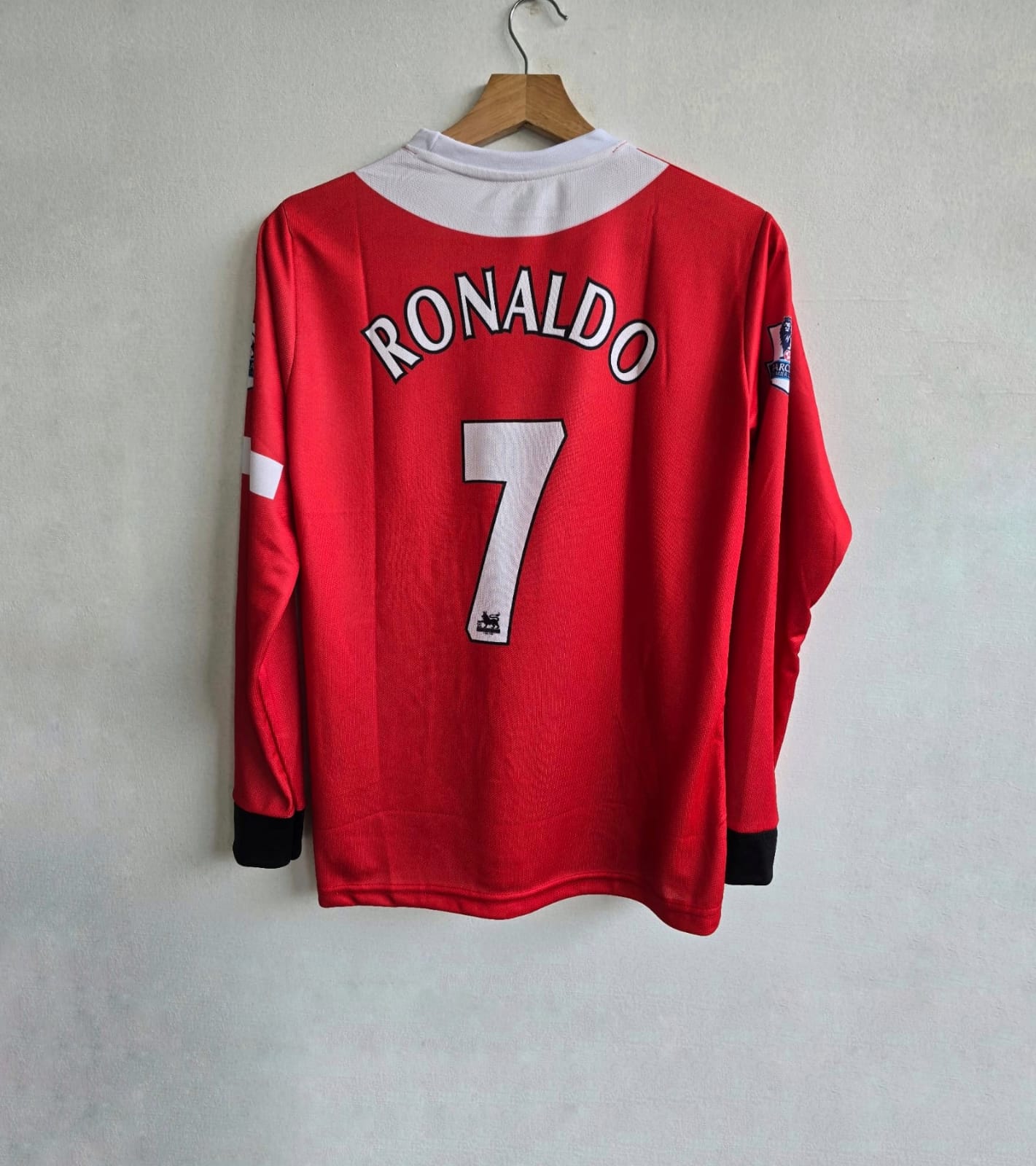 • Design: The jersey features the traditional red body with a white crew-neck collar and black cuff details on the long sleeves.
