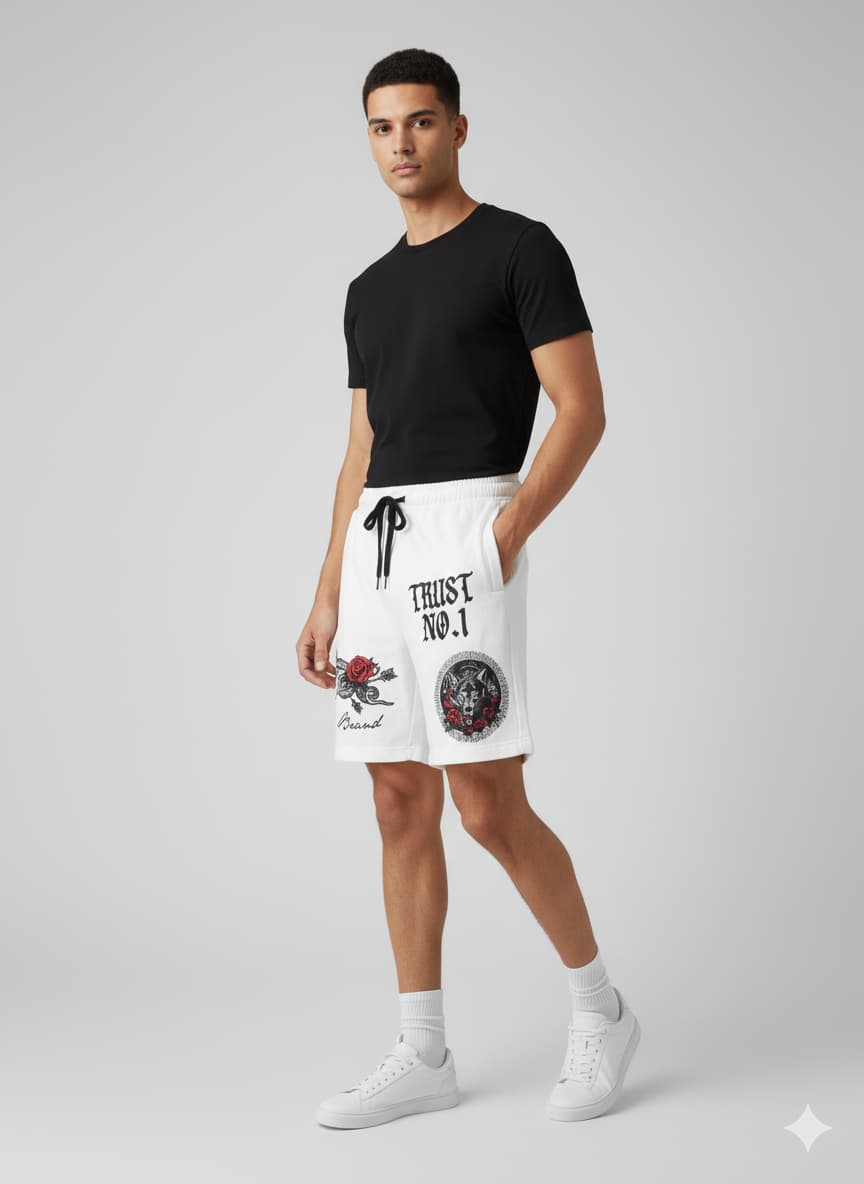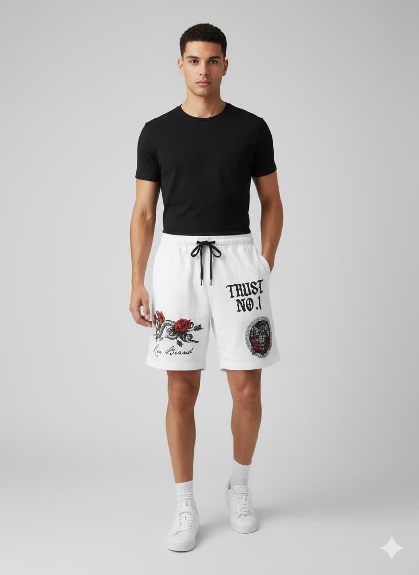 Upgrade your casual wear with these White Graphic Printed Street Shorts that fuse comfort with bold attitude. Crafted from premium cotton fleece, these shorts deliver a soft hand feel while keeping your streetwear look sharp. Featuring striking rose motifs, gothic script, and “Trust No.1” typography, this piece is made for those who like their style to speak louder than words.