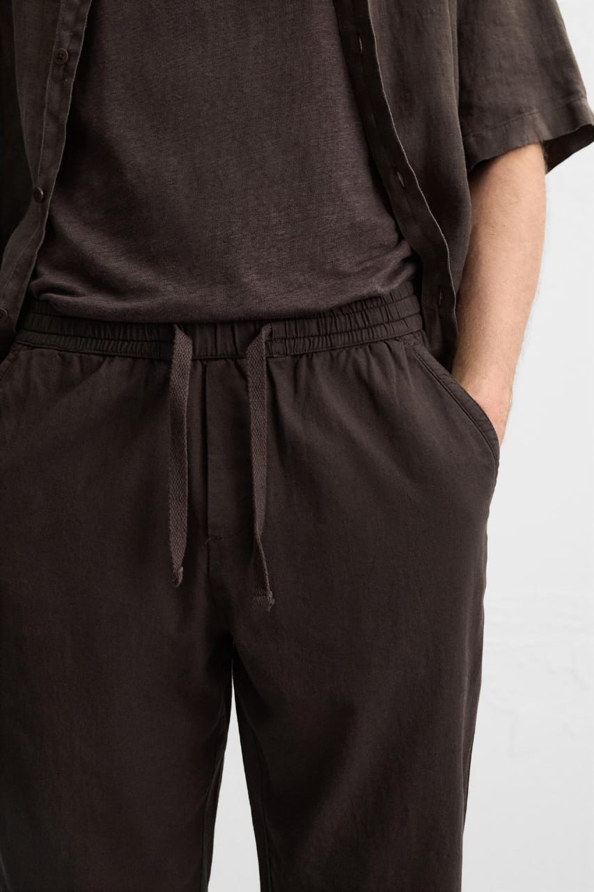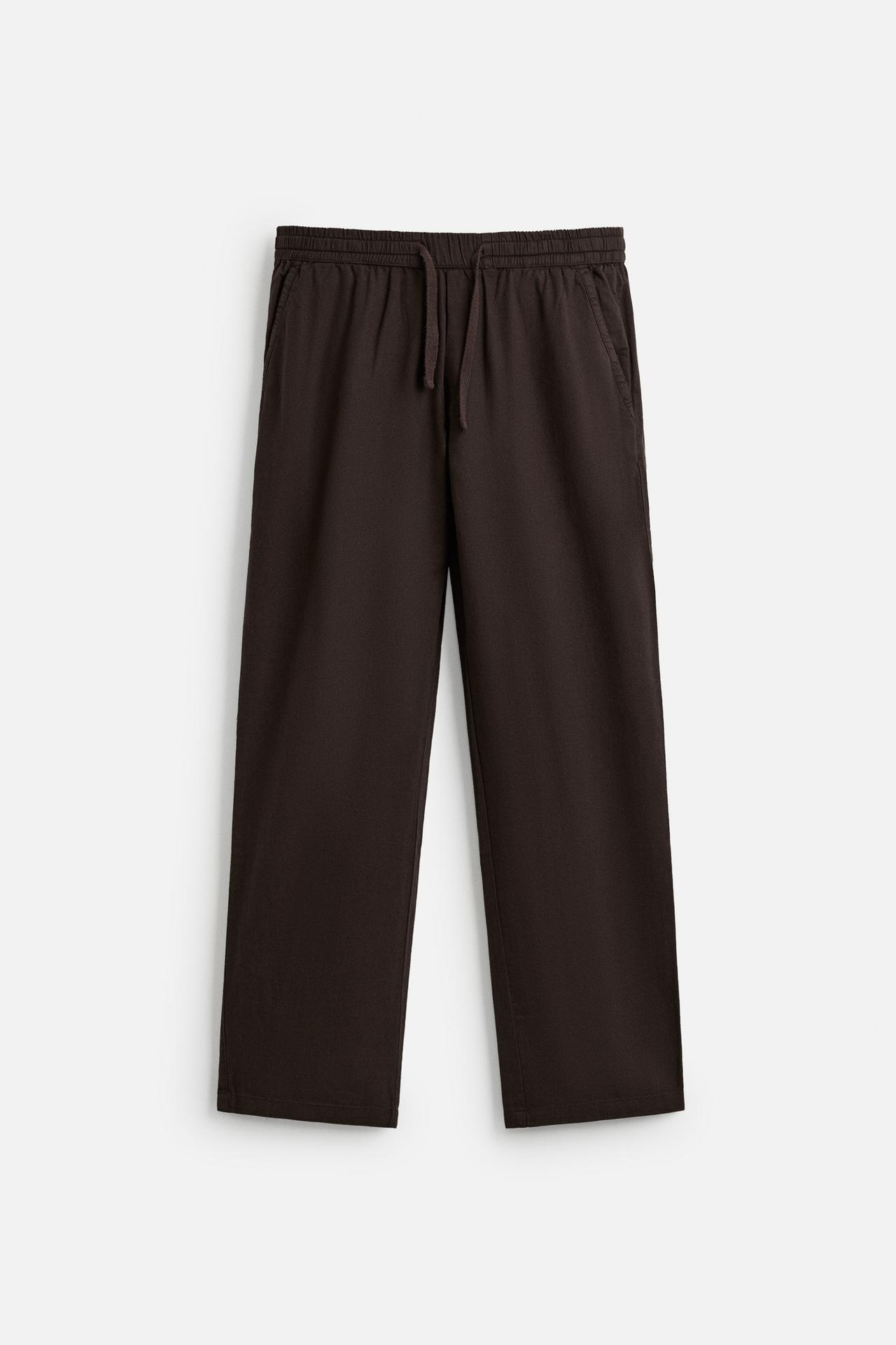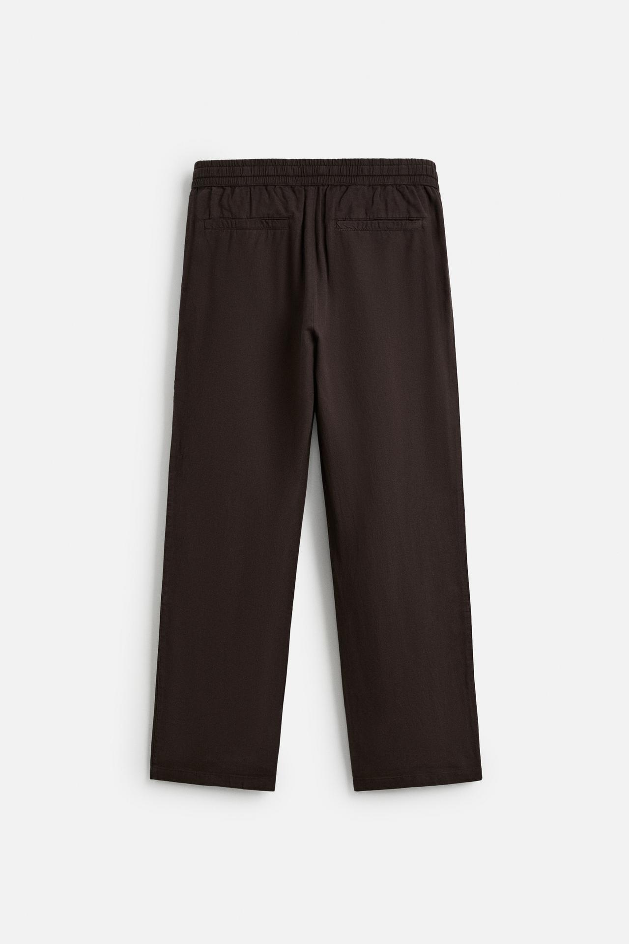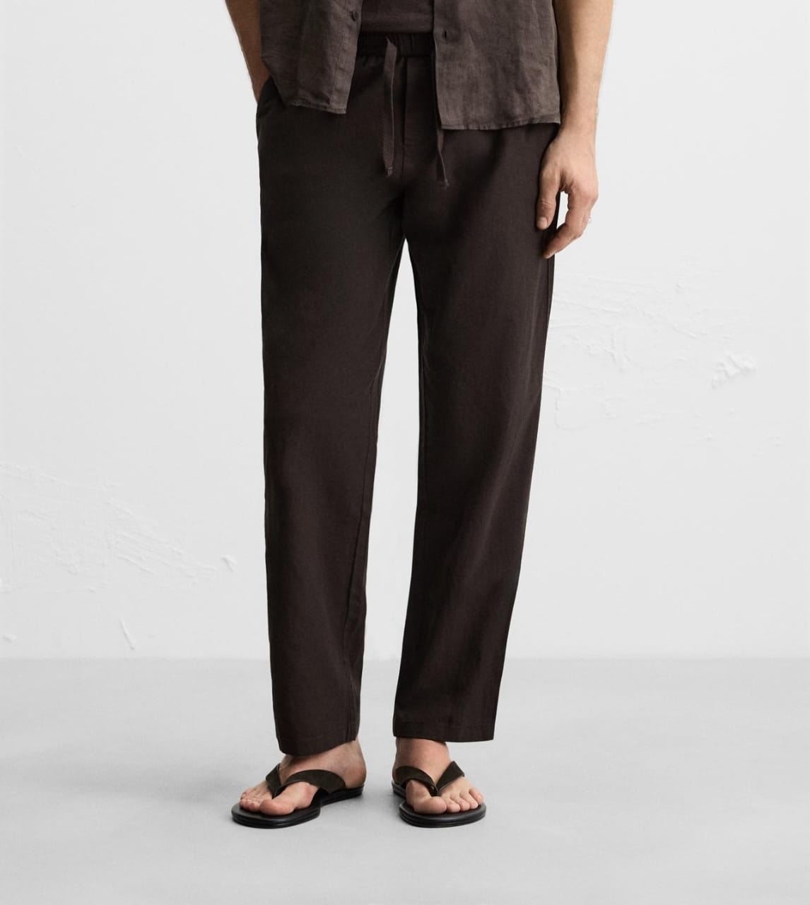 Refine your casual style with the sophisticated and comfortable Zara Men’s Dark Brown Linen Blend Trousers. These trousers are the perfect fusion of relaxed design and premium fabric, making them an ideal choice for both warm-weather days and stylish evenings.